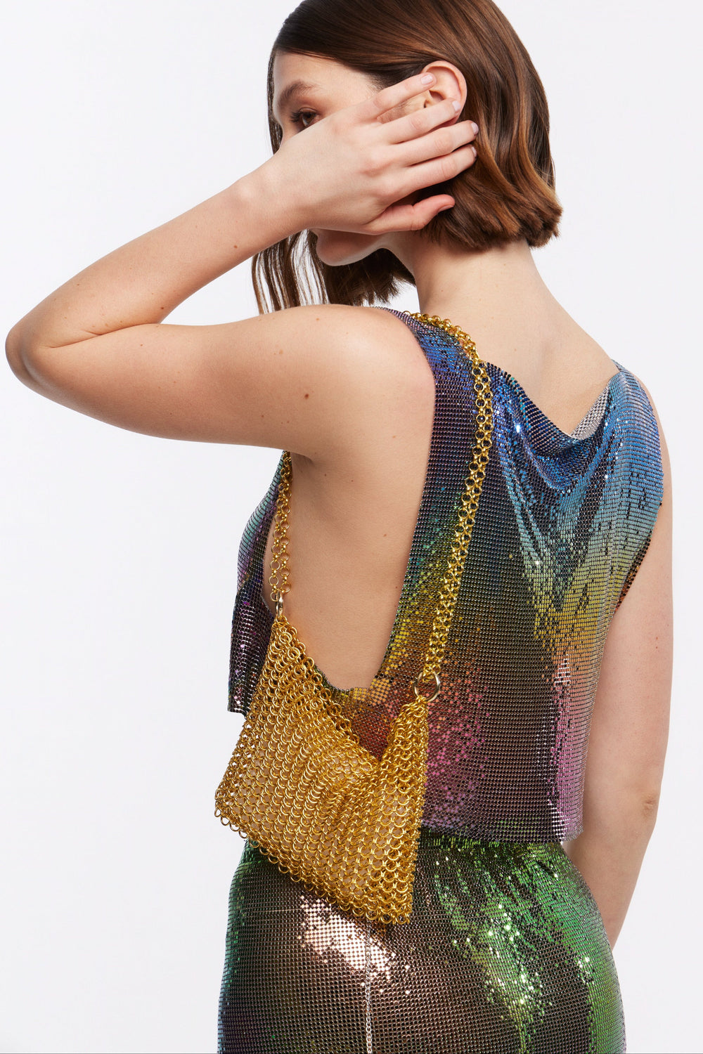 Style: A statement gold chainmail bag that pairs seamlessly with both eveningwear and elevated daytime looks