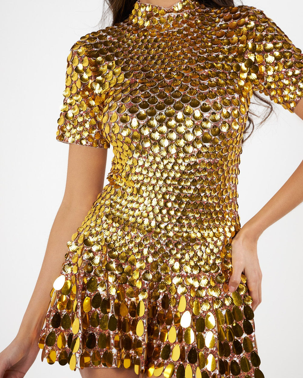 Retail Agenda introduces the Nala Dress, a statement of radiant glamour and confident femininity. Designed to command attention, this striking mini dress is fully adorned with hand-applied metallic sequins that shimmer brilliantly under every light. The sleek turtleneck silhouette adds a modern, elevated touch, while the body-contouring fit enhances your natural shape with effortless allure.
